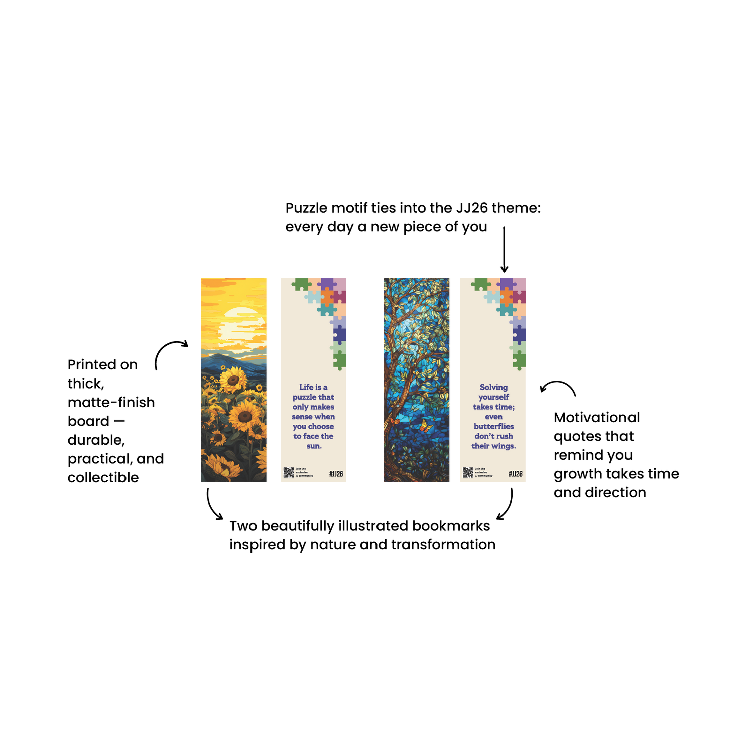 A set of two matte-finish cardboard bookmarks inspired by nature and growth. With motivational quotes and puzzle-inspired designs, they remind you that transformation takes time. Durable, collectible, and perfectly in sync with your JJ26 journey.