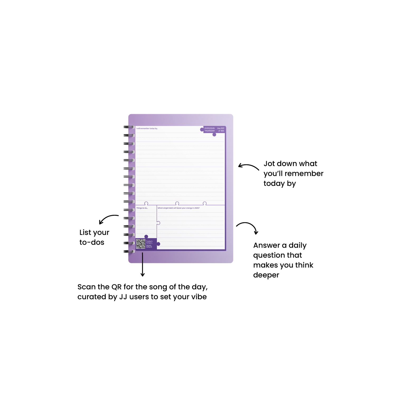 Your daily space for clarity and balance. Record what you’ll remember today by, list to-dos, and answer a thoughtful daily prompt. Plus, scan the QR to discover a new song each day, handpicked by JJ users to set your mood right.