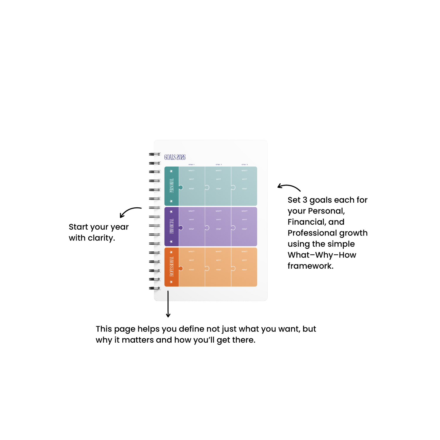 Start with focus : set personal, financial, and professional goals using the simple What–Why–How method. This page turns vague resolutions into actionable plans, giving your year direction and purpose right from page one.
