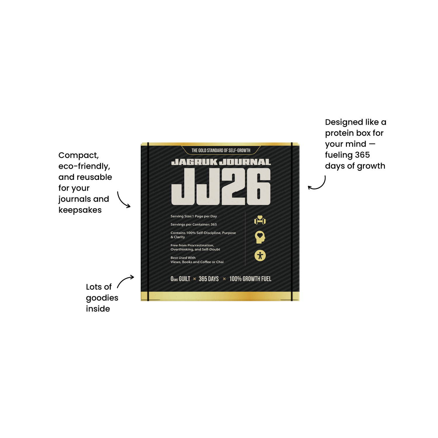 Inspired by protein packaging, this gold-black box fuels your 365 days of discipline and clarity. Compact, eco-friendly, and reusable, it’s filled with mindful tools for your year ahead. Each “nutritional fact” reminds you that consistency is your daily dose of progress.