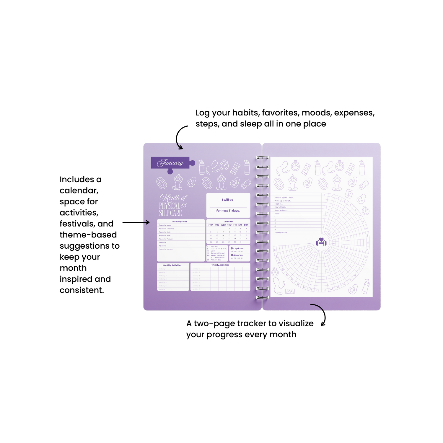 Two-page spread to track your habits, moods, steps, and favorites while planning activities and noting festivals. The design helps you visualize your progress month after month, making self-discipline a little more visual, fun, and achievable.