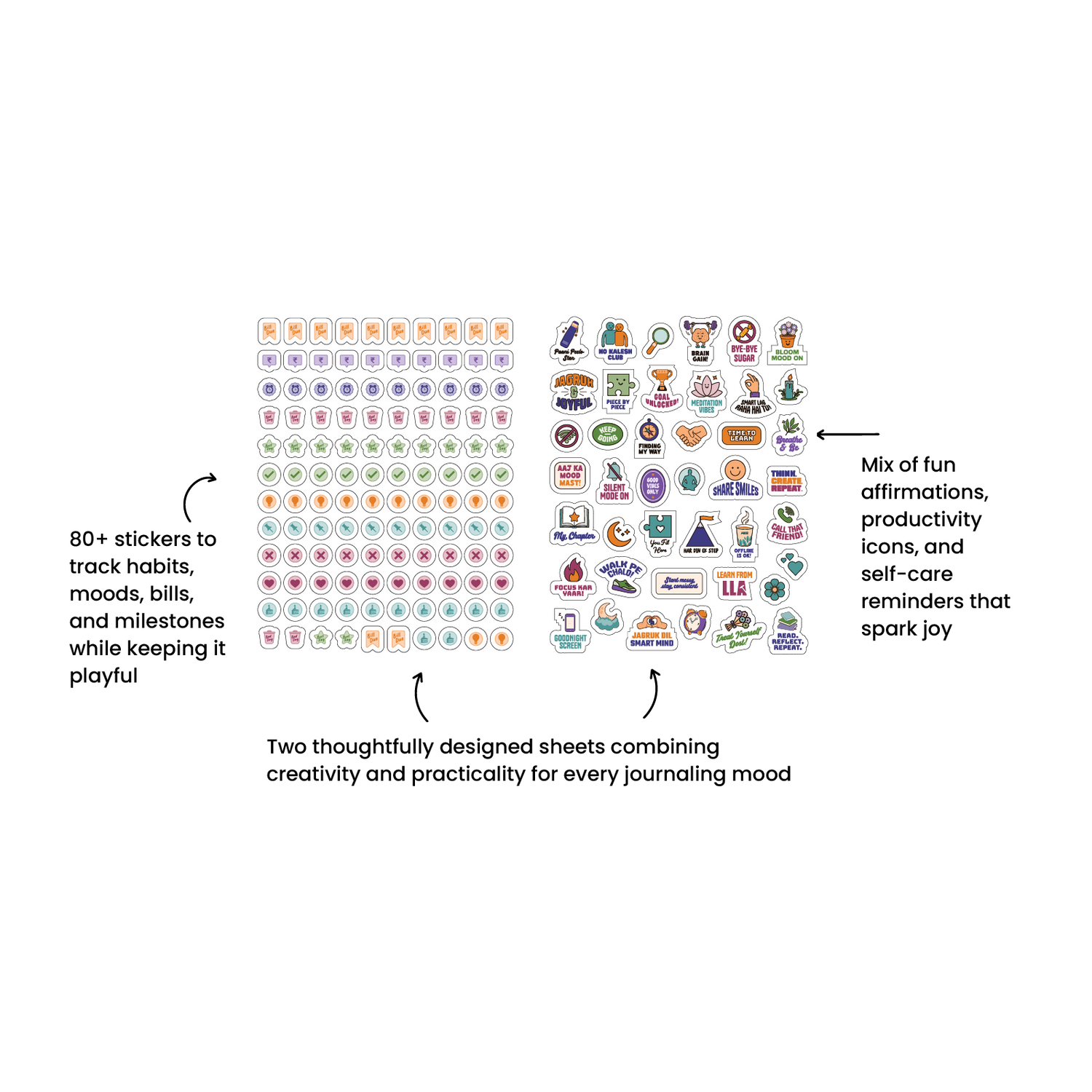 Two vibrant sheets : one for productivity, one for play. With 80+ stickers for tracking habits, moods, bills, and wins, they make journaling both practical and joyful. Designed to fit every mood and month, they turn reflection into something you’ll actually look forward to.