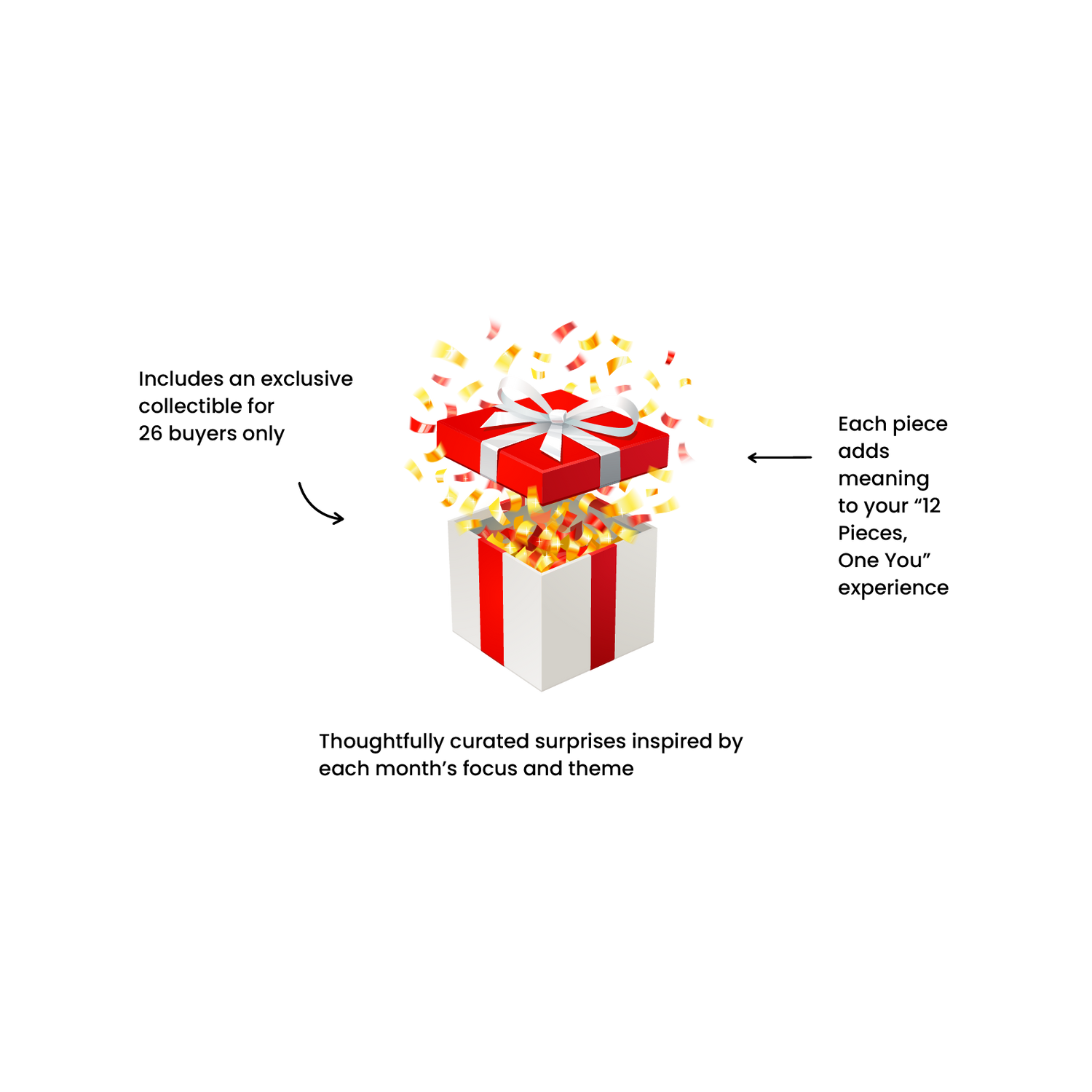 Every JJ26 box comes with surprise elements crafted around the monthly themes — practical yet playful additions to your self-growth toolkit. Designed to spark creativity and mindfulness, with an exclusive collectible for only 26 buyers hidden inside.